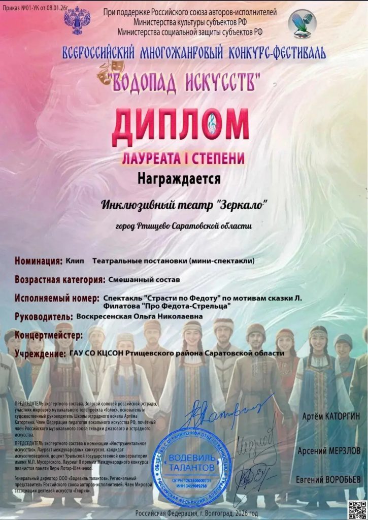 Инклюзивный театральный коллектив «Зеркало», созданный руководителем Ольгой Воскресенской, комплексного центра социального обслуживания населения Ртищевского района стал победителем Всероссийского фестиваля — конкурса «Водопад искусств».