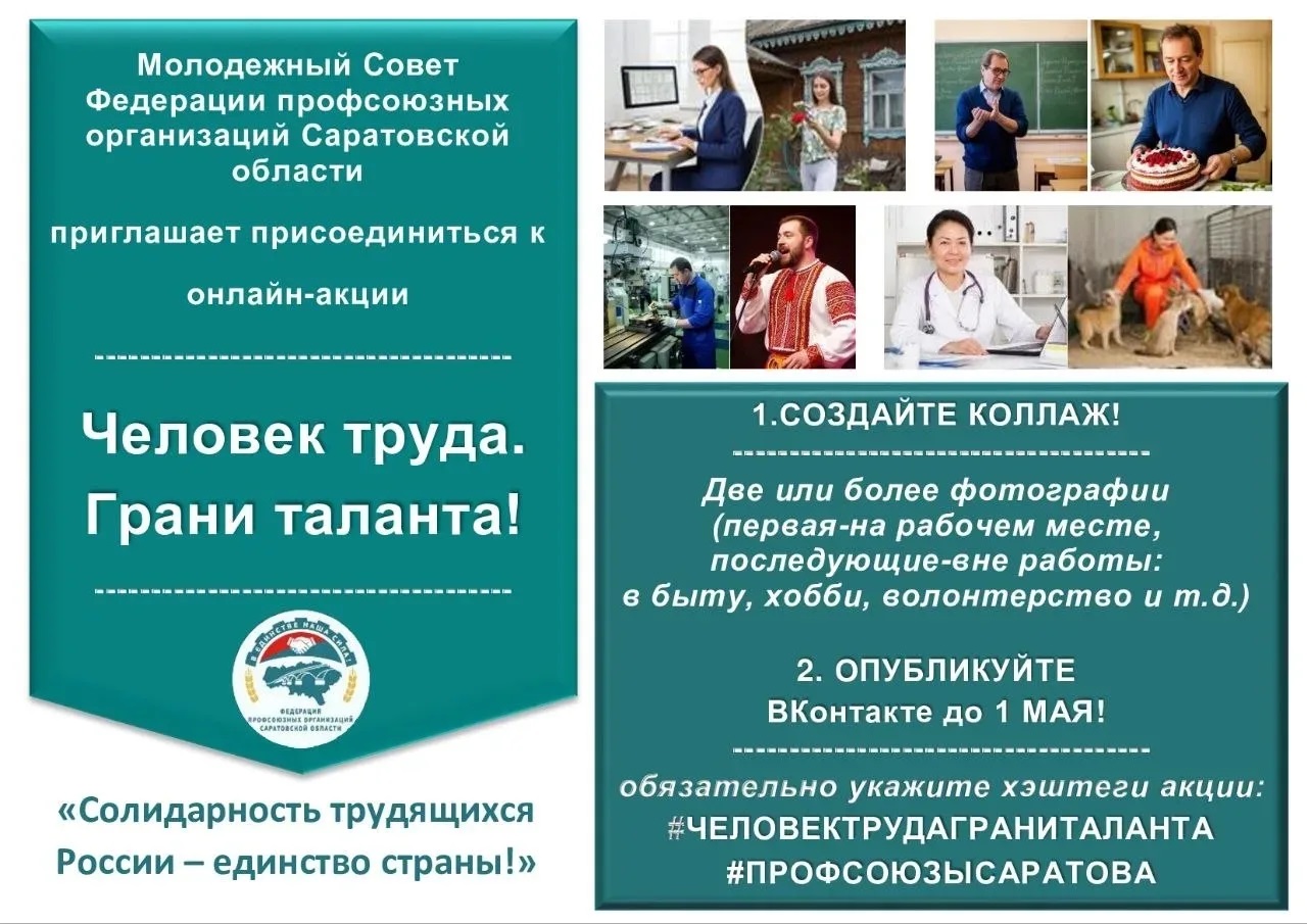 Молодёжный совет Федерации профсоюзных организаций Саратовской области приглашает присоединиться к онлайн-акции «Человек труда. Грани таланта!» Девиз акции: «Солидарность трудящихся России – единство страны!»