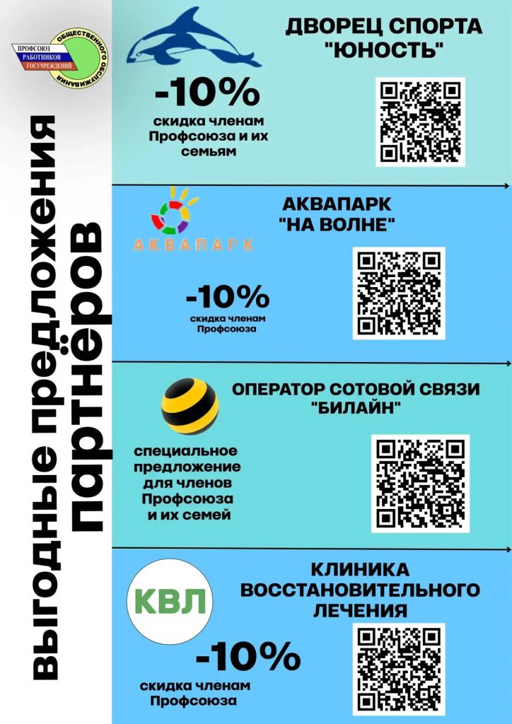 Профсоюз информирует о новых льготах для членов профсоюза и их семей. Обратите внимание на действующие скидки по партнёрским программам: