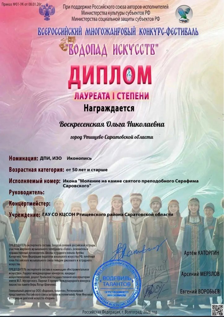 Дипломом лауреата I степени Всероссийского многожанрового конкурса — фестиваля «Водопад искусств» награждена Воскресенская Ольга Николаевна. Она представила жюри свою уникальную работу — икону «Моление на камне святого преподобного Серафима Саровского».