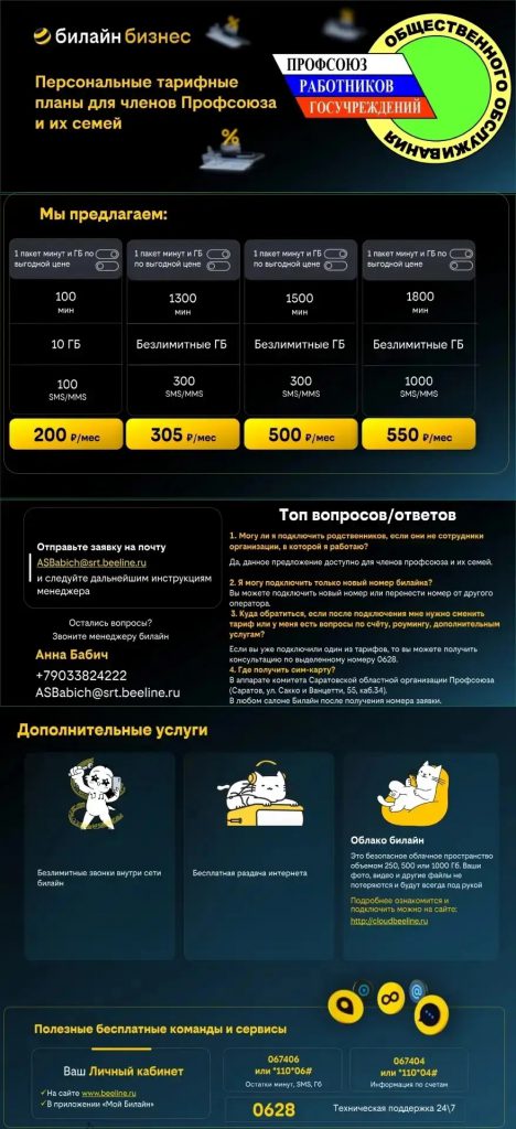 В рамках партнерства члены профсоюза и члены их семей получают доступ к тарифам на льготных условиях. Отмечается, что специальные цены на услуги связи не доступны в стандартных офисах продаж и предлагаются исключительно в рамках профсоюзной поддержки.