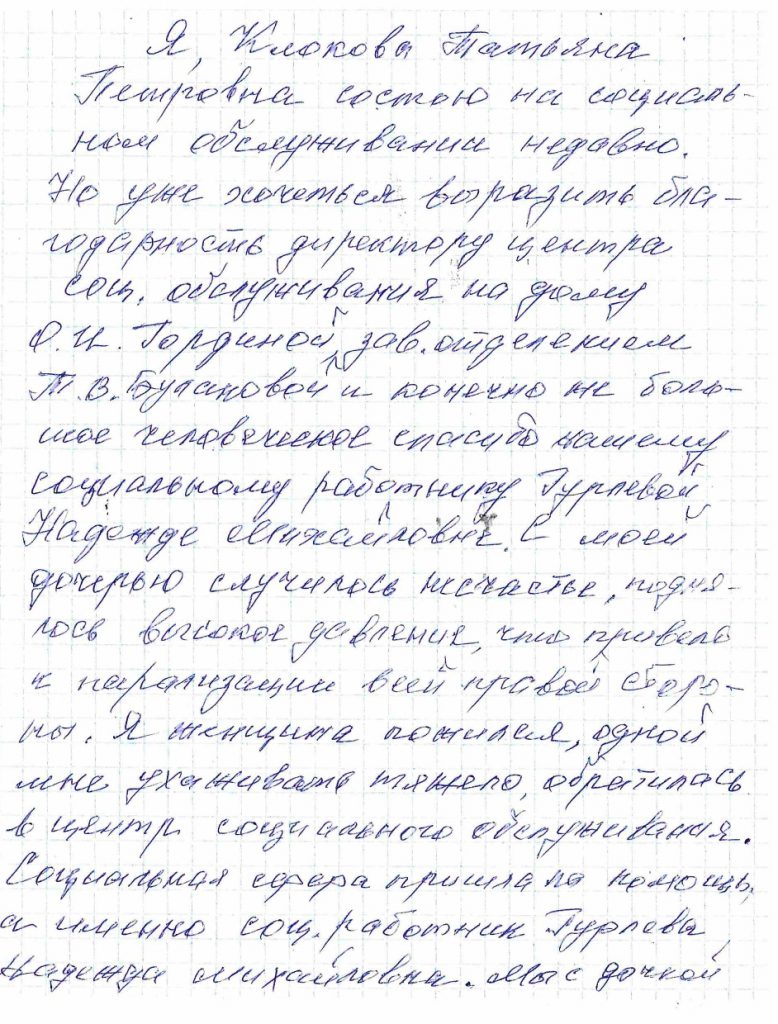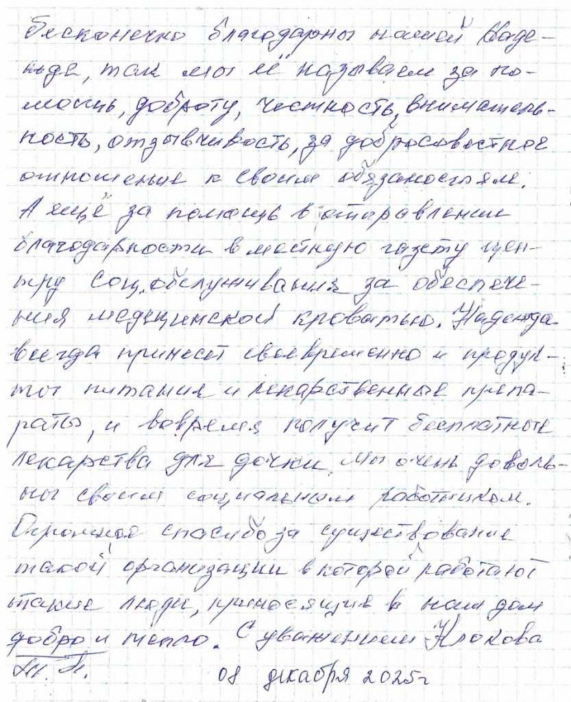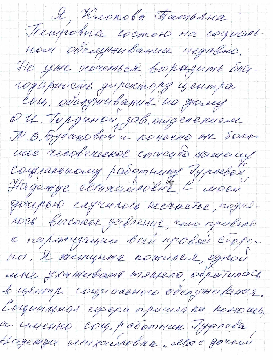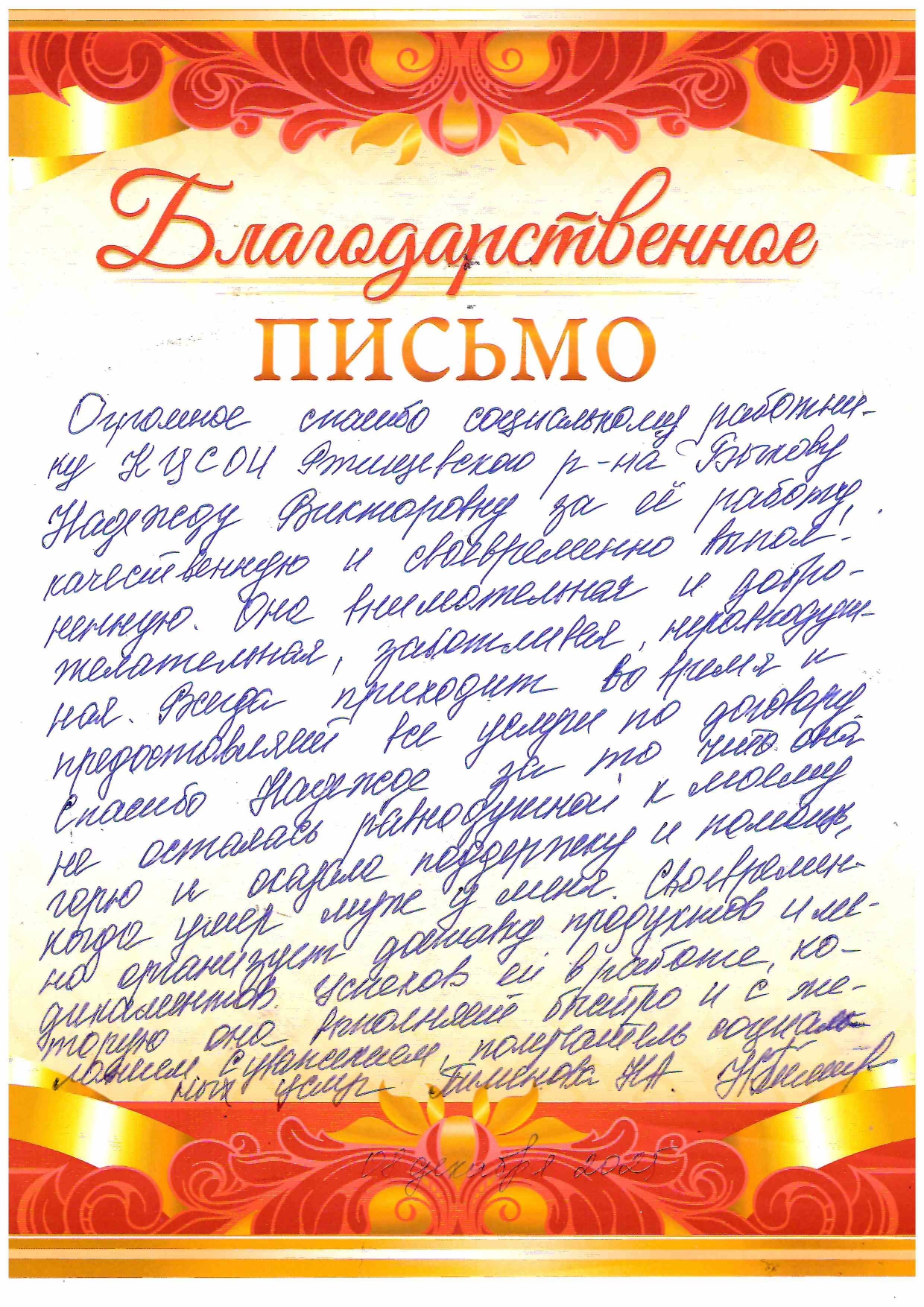 Благодарственное письмо социальному работнику комплексного центра Быковой Н.В.
