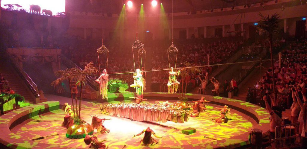 Для них была подготовлена незабываемая цирковая программа «Новогоднее тропик-шоу», где волшебник с бородой и посохом — сам Дед Мороз — вместе со своими помощниками-акробатами, воздушными гимнастами, жонглерами, артистами-клоунами и четвероногими друзьями организовали настоящее кругосветное путешествие прямо под куполом цирка!