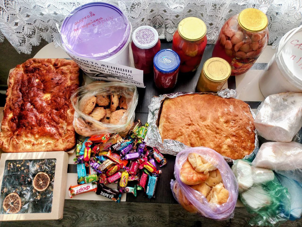 Помощь госпиталю Курска, собранная получателями социальных услуг пос. Правда Ртищевского района составила целых 70 килограммов вкуснейших домашних угощений: ароматное сало, румяная домашняя выпечка, сладкая кондитерская радость, душистые баночки домашнего варенья, хрустящие соленья, салатная капуста и пикантная морковка по-корейски.